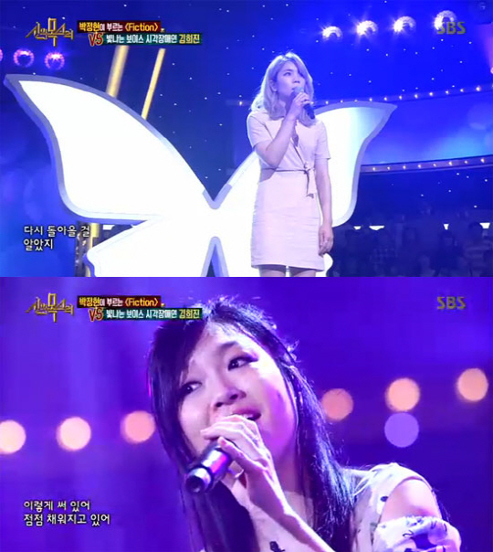 박정현은 이날 비스트의 'Fiction'을 선택받았다. 리허설 당시 랩부분에 걱정하던 박정현은 말하듯이 읽어 내려가며 랩을 소화해 모두를 놀라게 했다. 몽환적인 분위기로 매력적인 그의 목소리가 어우러진 곡은 전혀 다른 느낌으로 편곡됐다. 요정에서 거친 야수로 변신한 박정현의 새로운 모습이 결국 많은 선택을 받았다. 박정현은 김희진에게 "미안하다"는 인사를 전했다.