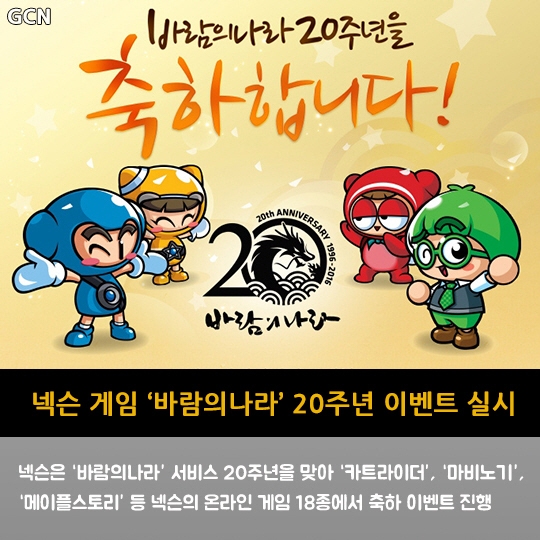 넥슨은 '바람의나라' 서비스 20주년을 맞아 '카트라이더', '마비노기', '메이플스토리' 등 넥슨의 온라인 게임 18종에서 축하 이벤트를 진행
