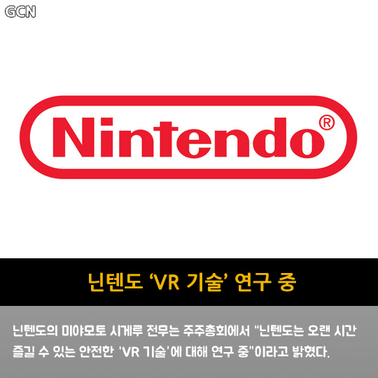 닌텐도의 미야모토 시게루 전무는 주주총회에서 "닌텐도는 오랜 시간 즐길 수 있는 안전한 VR 기술에 대해 연구 중"이라고 밝혔다.