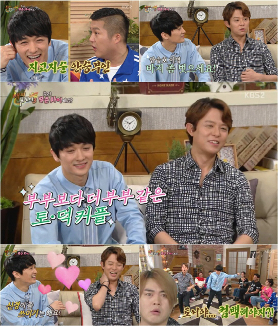 더욱이 토니안과 김재덕은 '절친'을 넘어서 '노부부' 포스를 뿜어내 폭소를 유발했다. 토니안은 "2-3년 정도 연애를 안 했는데 솔직히 여자친구의 필요성을 못 느낀다. 김재덕이 있다 보니 외로움을 덜 느낀다"고 밝혔고, 김재덕은 "여자친구가 있을 때 (토니안에게) 소원해지는데 신경이 쓰이기는 한다"고 털어놨다. 더욱이 두 사람은 "합동 결혼식과 동반 신혼여행을 생각했다"며 서로 미래를 그렸음을 고백했고, 이에 유재석은 "여자친구와 미래를 그려야지 왜 둘이서 미래를 그리냐"며 토덕커플의 유별난 우정을 꼬집어 웃음을 터뜨렸다. 이에 굴하지 않고 김재덕은 "결혼 후에도 서울 외곽에 공동주택에서 함께 사는 그림을 그리고 있다"고 털어놓기에 이르렀다. 이 같은 못 말리는 토덕커플의 각별한 우정스토리에 엄현경과 신혜선은 "(만약에 김재덕의 여자친구라면) 못 만날 것 같다"고 혀를 내둘러 배꼽을 잡게 만들었다.