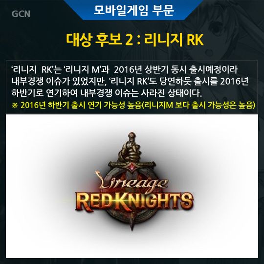 모바일게임 부분 연기(延期)대상은 선정하는데 큰 고민이 없었다. 2016년 상반기 출시할 것이라 개발사는 말하였지만, 대부분의 유저들은 상반기 출시를 믿지 않았다. 당연하듯이 출시를 연기해준 '리니지M'과 '리니지 RK'에 연기(延期)대상을 공동으로 수상하게 되었다.