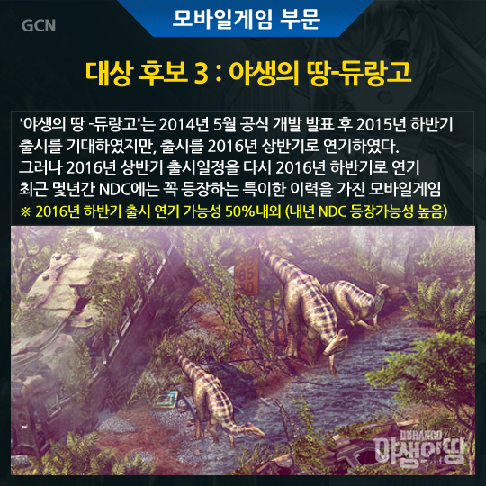 '야생의 땅 -듀랑고'는 2014년 5월 공식 개발 발표 후 2015년 하반기 출시를 기대하였지만, 출시를 2016년 상반기로 연기하였다.그러나 2016년 상반기 출시일정을 다시 2016년 하반기로 연기 최근 몇년간 NDC에는 꼭 등장하는 특이한 이력을 가진 모바일게임