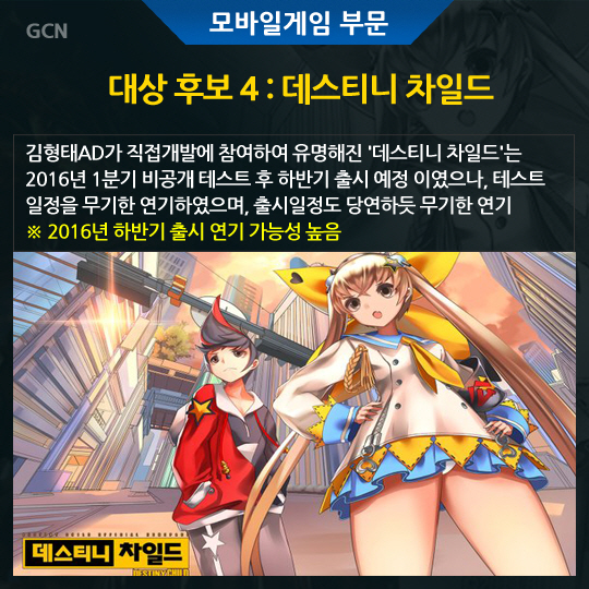 김형태AD가 직접개발에 참여하여 유명해진 '데스티니 차일드'는 2016년 1분기 비공개 테스트 후 하반기 출시 예정 이였으나, 테스트 일정을 무기한 연기하였으며, 출시일정도 당연하듯 무기한 연기되었다.