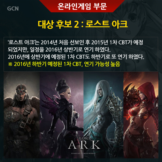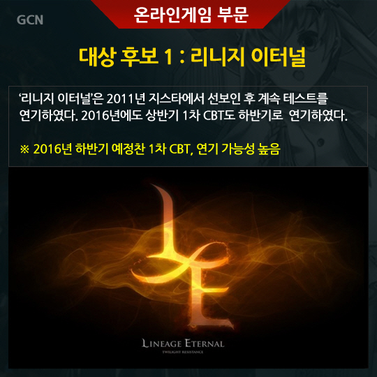 '리니지 이터널'은 2016년 1차 CBT를 할 것이라 대부분의 사람들이 믿었지만, 당당히 2016년 하반기로 1차 CBT를 연기한 '리니지 이터널'이 연기(延期)대상을 수상하게 되었다.