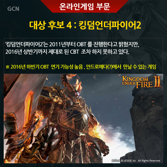 킹덤언더파이어2는 2011년부터 OBT를 진행한다고 밝혔지만, 2016년 상반기까지 제대로 된 CBT 조차 하지 못하고 있다.