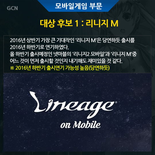 2016년 상반기 가장 큰 기대작인 '리니지 M'은 당연하듯 출시를 20165년 하반기로 연기하였다.올 하반기 출시예정인 넷마블의 '리니지2 모바일'과 '리니지 M'중 어느 것이 먼저 출시할 것인지 내기해도 재미있을 것 같다.