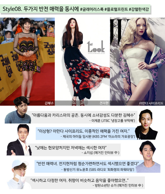 여자들의 로망인 남자 스타들. 알고 싶고 닮고 싶은 그들의 이상형을 낱낱이 파헤쳤다. 핫한 남자 스타들이 밝힌 이상형의 조건을 토대로 그에 부합하는 세 명의 여자 스타를 선택해 그들의 패션 스타일을 분석해봤다. 남자들이 좋아하는 여성상은 도대체 어떤 것인지, 또 그런 여성이 되기 위해서 갖춰야 할 '잇 아이템'은 무엇인지 파악해보자.