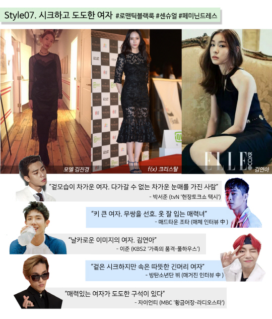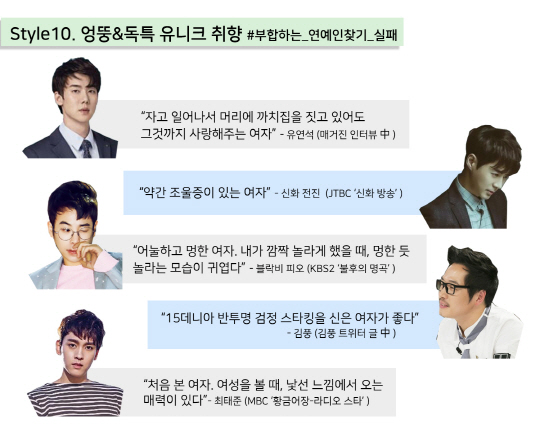 도저히 그들의 취향에 맞게 스타일을 제시할 수 없는 독특한 이상형을 밝힌 남자 스타들도 있었습니다. 각각 전혀 다르면서 확고한 자신만의 여성상을 밝혔는데요. 엉뚱하지만 개성 넘치는 이들의 스타일 또한 '취존(취향 존중)'해야 겠죠?