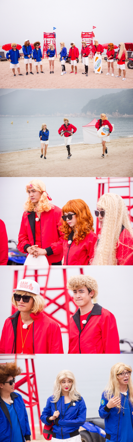 이날 연예계 대표 몸짱인 이기우, 닉쿤, 경리와 함께 런닝맨 멤버들은 각자 금발 가발을 쓰고 미국 드라마 '베이워치' 속 '수상 구조대원'으로 완벽 변신했다.