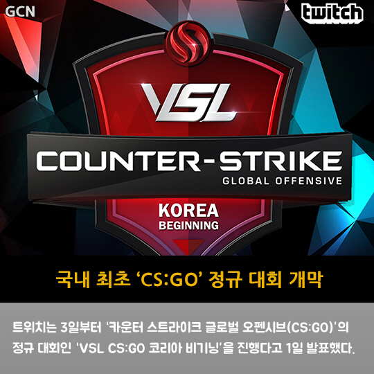트위치는 3일부터 '카운터 스트라이크 글로벌 오펜시브(CS:GO)'의 정규 대회인 'VSL CS:GO 코리아 비기닝'을 진행다고 1일 발표했다.