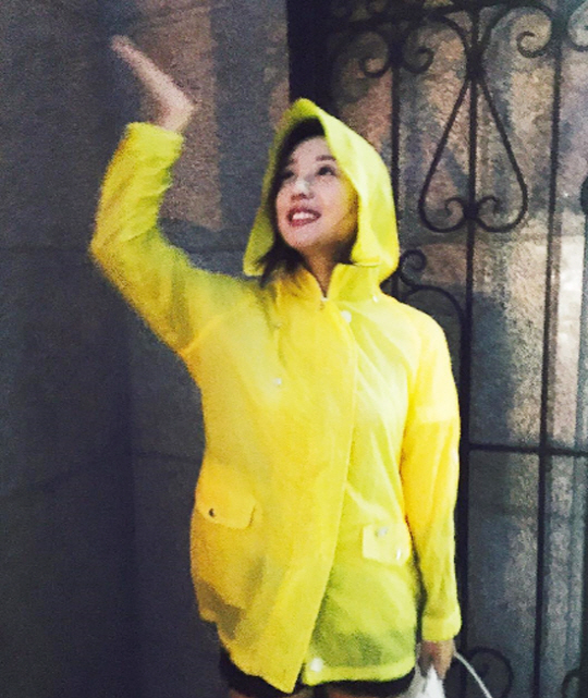 이어 우산 대신 노란색 우비를 착용한 그는 손으로 비를 맞으며 환한 여신 미소를 지어보이고 있어 보는 이들의 심장을 심쿵하게 했다.
