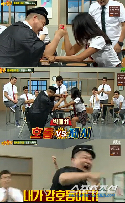 제시와 민경훈의 팔씨름 맞대결이 시작됐다. 민경훈의 팔이 부들부들 떨렸다. "이정도면 제시가 승리한 것"으로 인정받았다. 제시는 거침없이 천하장사 강호동에게 도전장을 내밀었다. 강호동이 제시를 배려해 손가락 2개로 경기에 임했다. 손가락 2개만으로 괴력을 발휘했다. 순식간에 제시의 팔을 내리꽂았다. 강호동은 천하장사다운 완벽한 승리를 뜨거운 세리머니로 자축했다.
