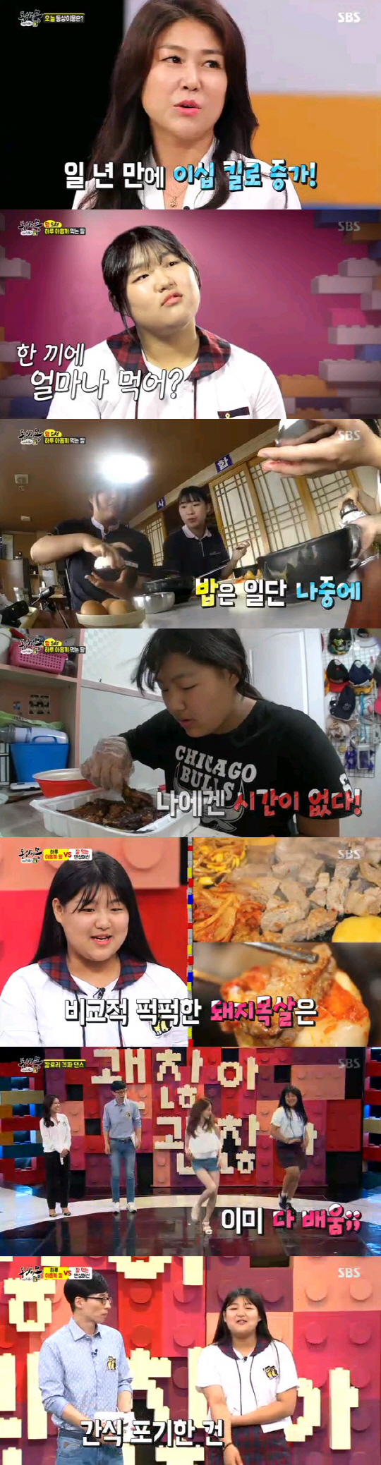 하지만 그녀도 살을 빼려고 노력해본 적이 있다고. 유진 양은 "한달에 10kg을 빼본 적 있다. 점심시간에 두유와 고구마 두개만 먹고, 밤에는 물만 먹었다. 그런데 사는게 아니라 버티는 수준이었다. 너무 힘들었었다"고 전했다.