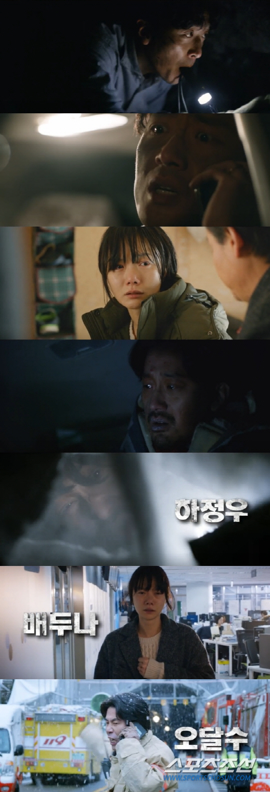 또한 공개된 예고편에서는 세 배우의 탁월한 연기력도 엿볼 수 있다. 가족에게 돌아가기 위해 치열한 생존기를 펼치는 정수 역의 하정우는 현실감 있는 연기는 아이러니한 웃음을 유발한다. 정수의 아내 세현 역의 배두나는 실제 피해자 가족의 아픔을 완벽하게 표현해내며 관객들을 단번에 몰입하게 한다. 정수의 구조를 위해 고군분투하는 구조대장 대경 역의 오달수 역시 자신만의 매력으로 따뜻하면서도 친근한 캐릭터를 구축해 냈다. 짧은 예고편에서도 만날 수 있는 세 배우의 빛나는 연기는 범접할 수 없는 시너지를 내고 있다.