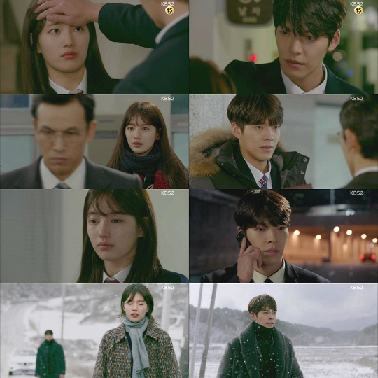 이날 방송에서는 김우빈과 배수지가 과거 고등학교 시절 복잡하게 얽히고설키게 된 운명적 만남에 대해 그려졌다. 고등학생 시절 자신의 친부가 검사 최현준(유오성)이라는 사실을 알게 된 신준영(김우빈)은 최현준이 보는 앞에서 노을(배수지)에게 창피를 당했고 이를 갚아주려 노을과 사귀는 100일 퍼포먼스까지 펼쳤던 상황. 이로 인해 노을은 학교에서 친구의 남자를 빼앗은 나쁜 애로 낙인 됐다. 엎친 데 덮친 격으로 뺑소니 교통사고를 당했던 노을의 아버지는 숨을 거뒀고, 아버지가 진 빚 때문에 노을과 동생은 야반도주를 했던 것. 그 후 늘 노을에게 신경이 쓰였던 신준영은 어느 날 노을의 전화를 받았고, 아빠 장례식을 도와줘서 고맙다는 노을의 말에 눈빛이 흔들렸다.