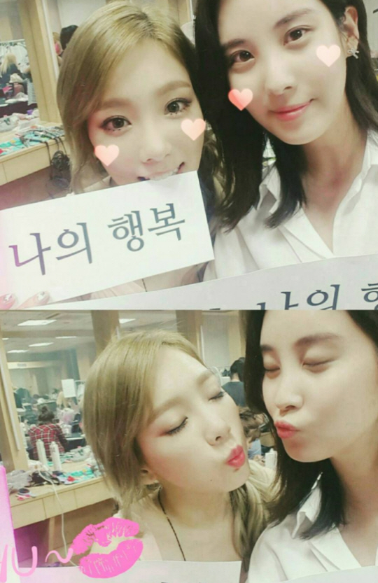 사진 속 서현은 태연과 나란히 얼굴을 맞대고 밝게 웃고 있다. 또 다른 사진에서 태연과 서현은 마치 뽀뽀를 하려는 듯한 포즈를 취하고 있다.