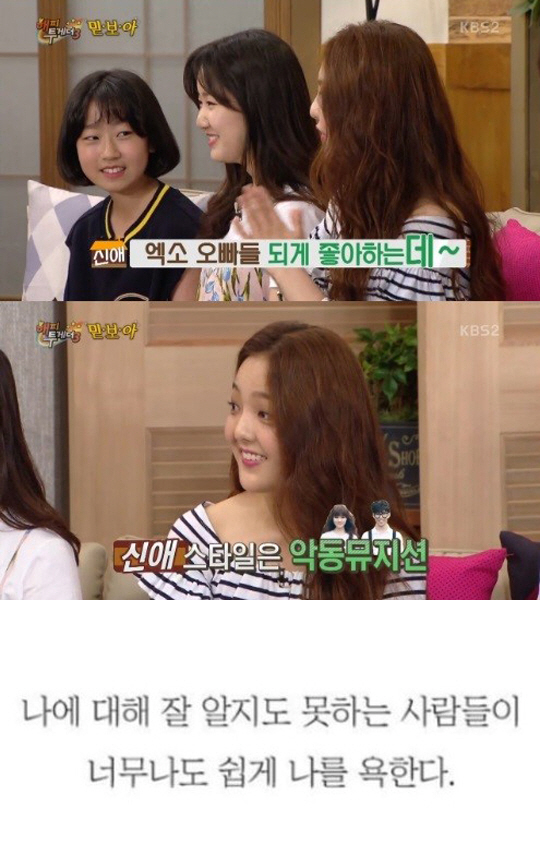 서신애는 최근 진지희 김환희, 엑소 수호 찬열 첸과 함께 KBS 2TV '해피투게더3'에 출연한 바 있다. 당시 서신애는 "엑소 오빠들 되게 좋아하는데, 제 스타일은 악동뮤지션", 김환희는 "엑소도 좋아하지만 방탄소년단 팬"이라고 밝혀 좌중을 폭소케 한 바 있다.