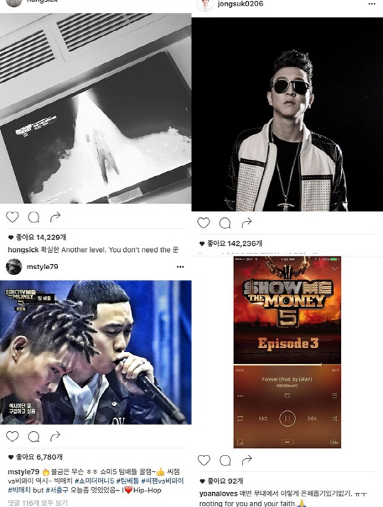 [스포츠조선닷컴 김준석 기자] 국내 최초 래퍼 서바이벌 Mnet '쇼미더머니5'가 단 한 명의 우승자를 가리는 파이널만 남겨두고 있다. 사이먼도미닉-그레이 팀의 비와이, 자이언티-쿠시 팀의 씨잼, 도끼-더 콰이엇 팀의 슈퍼비가 파이널에 진출한 가운데, 국내 톱스타들이 SNS를 통해 '쇼미더머니5' 래퍼들에게 열렬한 지지와 응원을 전해 눈길을 끌고 있다.