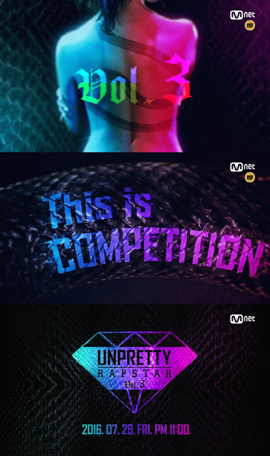 함께 공개된 첫 티저영상(tvcast.naver.com/v/979289)에는 긴장감이 감도는 배경음악과 함께 '언프리티 랩스타 3'에 출연하는 여자 래퍼 10인이 저마다 강렬한 포스를 풍기며 등장해 눈길을 모은다. 독을 품은 뱀과 출연진이 번갈아 나오며 "위 아 낫 어 팀. 디스 이즈 컴페티션(We're not a team. This is competition)"을 외치는 모습에서 이번 시즌 더욱 독한 경쟁이 펼쳐질 것임을 예고하고 있다. 오는 29일(금) 밤 11시 첫방송.