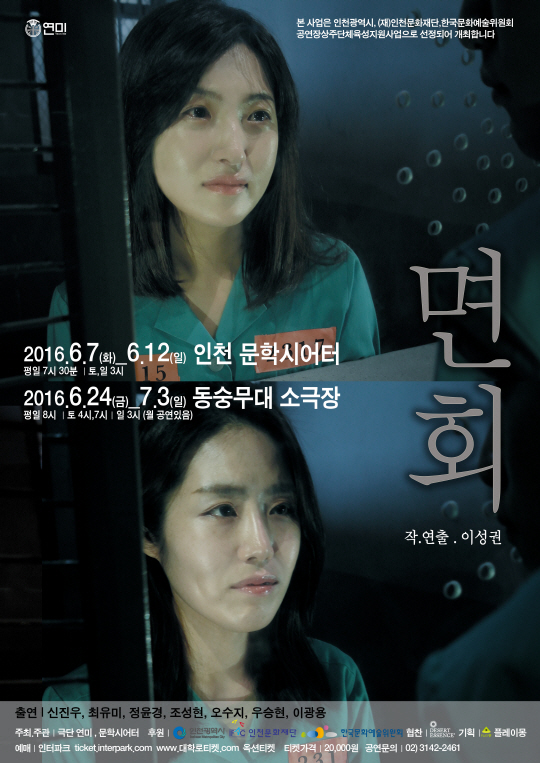 한편, '면회'는 '2016 인천문화재단 공연장 상주단체 육성지원사업 선정작'으로 지난 7일 인천 문학경기장 문학시어터에서 성공적으로 초연을 펼쳤다. 연극 '면회'에 대한 자세한 사항은 전화(02-3142-2461)로 문의하면 된다.