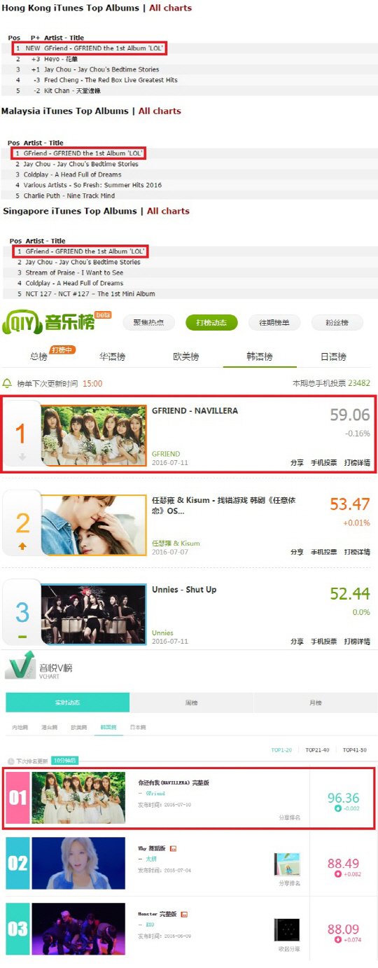 11일 0시에 공개된 여자친구의 첫 정규앨범 'LOL'은 발매 이후, 현재(오후 2시 기준) 홍콩, 말레이시아, 싱가포르 등 3개국 아이튠즈 앨범차트에서 1위를 차지했다. 또한 태국 2위, 타이완 3위, 인도네시아 8위 등 상위권에 랭크되는 저력을 과시했다.