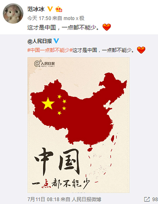 빅토리아는 이날 국제상설중재재판소(PCA)가 중국-필리핀의 남중국해 영유권 분쟁에 대해 필리핀의 손을 들어준 것에 대한 항의의 뜻을 표한 것. 빅토리아 뿐 아니라 중국을 대표하는 헐리우드 스타 판빙빙(35) 역시 자신의 웨이보에서 같은 입장을 밝혔다.