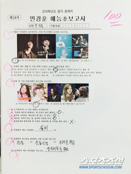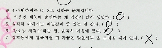 4-7번은 O,X퀴즈. 여기서 주목해야할 포인트는 6번과 7번 문항입니다. 6번은 '강호동 저격수'라는 말, 솔직히 마음에 든다는 문항, 그는 거침없이 O를 그렸습니다. 또 7번 '강호동에게 깝죽거릴 때 가끔은 맞을까봐 좀 두려울 때가 있다'에도 눈치보지 않고 X를 그렸네요.