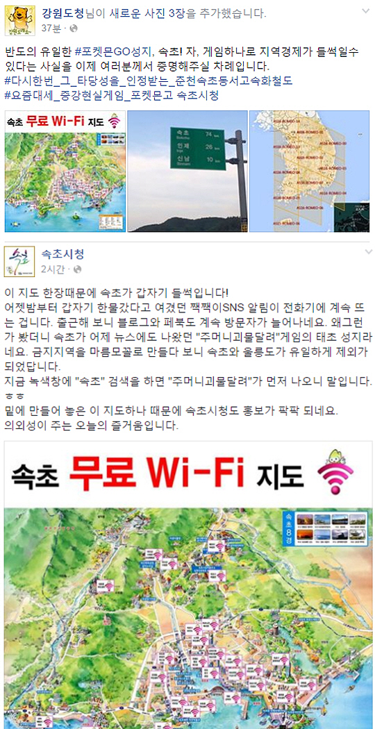여름 휴가철에 더해 갑작스런 호재를 맞은 강원도청과 속초시청 등 해당 지자체는 신이 났다. 강원도청은 "반도내 유일한 포켓몬 GO 성지로 오라"라며 흥행몰이에 나섰고, 속초시청은 속초시내 무료 와이파이 지도를 공개하며 열기를 더하고 있다.