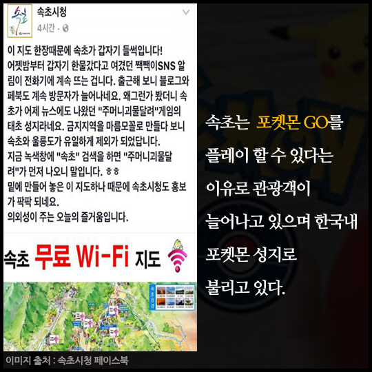 속초는 "포켓몬 GO"가 플레이 할 수 있다는 이유로 관광객이 늘어나고 있으면 한국내 포켓몬 성지로 불리고 있다.