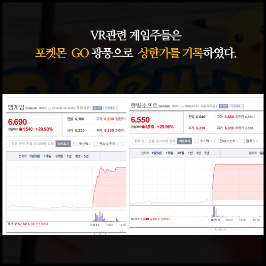 VR관련 게임주주들은 '포켓몬 GO' 광풍으로 상한가를 기록하였다.