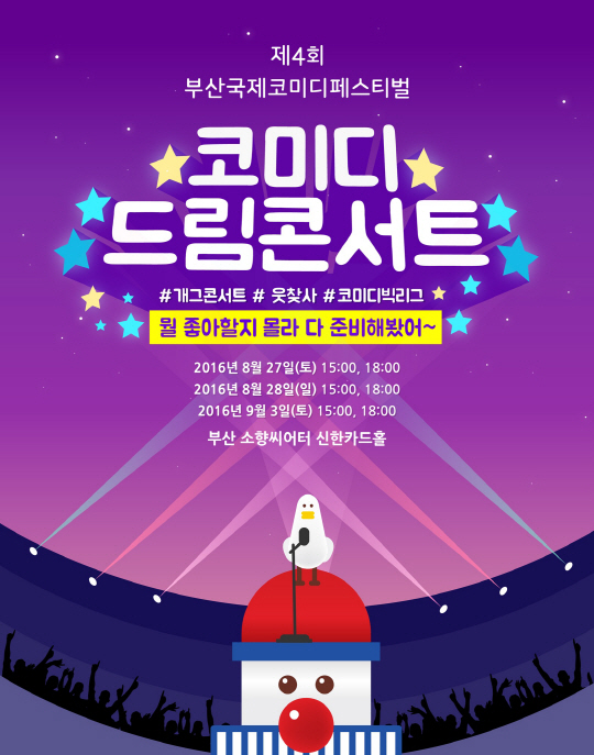 한편, '부산국제코미디페스티벌'은 초호화 스케일과 탄탄한 완성도로 코미디산업 활성화 및 코미디 한류 열풍을 주도하고 외국인 관광객을 유치, 도시경제와 문화발전에도 큰 기여를 할 것으로 관심을 모으고 있다.