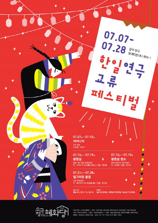 한국과 일본의 젊은 연극인들이 펼치는 한일연극교류페스티벌 '같이 연극 한(韓) 본(本) 하자~!'가 28일까지 대학로 소극장 혜화당에서 열린다. 공공 지원금을 한 푼도 받지 않고 한국과 일본의 연극인들 스스로 기획하고 제작한 프로젝트다.