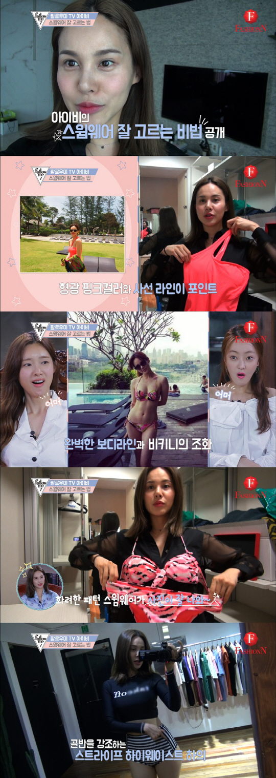아이비는 원피스 이외에도 홀터넥 비키니와 래시가드, 하이웨스트 등 다양한 수영복 스타일을 소개했다. 특히 아이비는 단숨에 시선을 사로잡는 화려한 패턴과 색감을 자랑하는 홀터넥 비키니를 여러 가지 보유하고 있어 눈길을 끌었다. 그는 "화려한 패턴 비키니가 몸매보다 더 날씬하게 보인다"며 꿀팁 전달을 잊지 않았다.