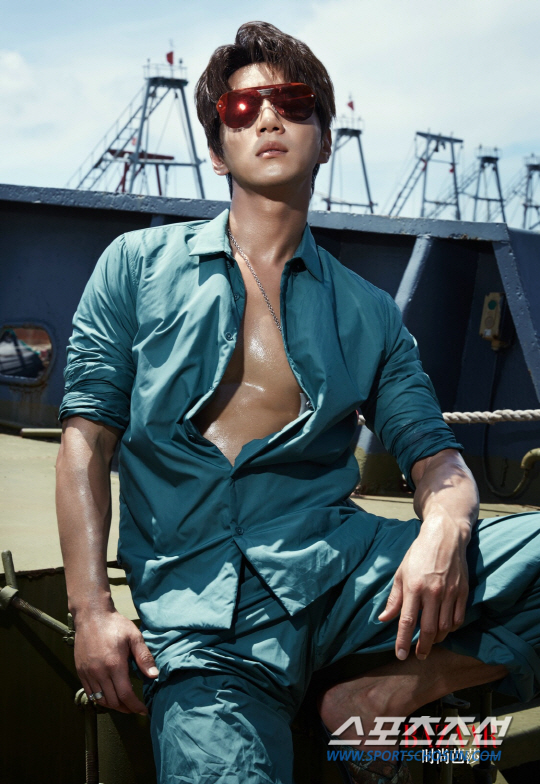 살짝 풀어헤친 셔츠 사이로 드러난 검게 그을린 명품 복근과 강렬한 눈빛으로 상남자 포스를 풍겼다.