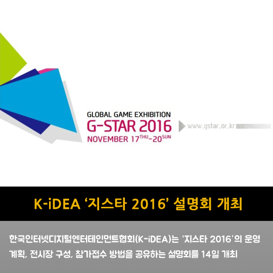 한국인터넷디지털엔터테인먼트협회(K-iDEA)는 '지스타 2016'의 운영 계획, 전시장 구성, 참가접수 방법을 공유하는 설명회를 14일 개최
