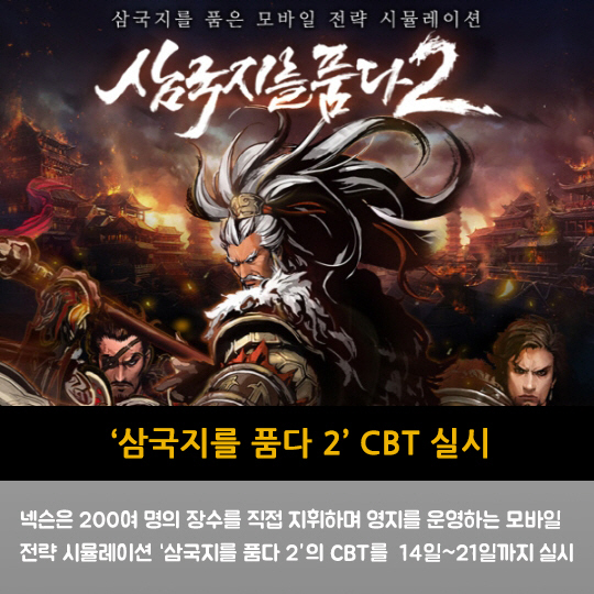 넥슨은 200여 명의 장수를 직접 지휘하며 영지를 운영하는 모바일 전략 시뮬레이션 '삼국지를 품다 2'의 CBT를 14일~21일까지 실시