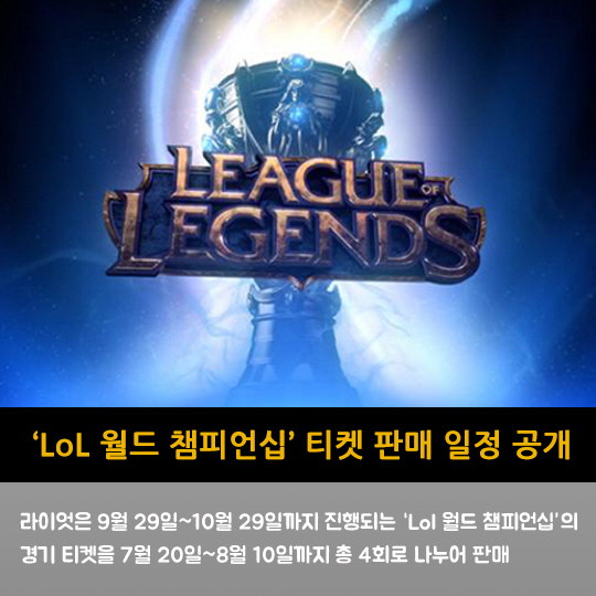 라이엇은 9월 29일~10월 29일까지 진행되는 'Lol 월드 챔피언십'의 경기 티켓을 7월 20일~8월 10일까지 총 4회로 나누어 판매