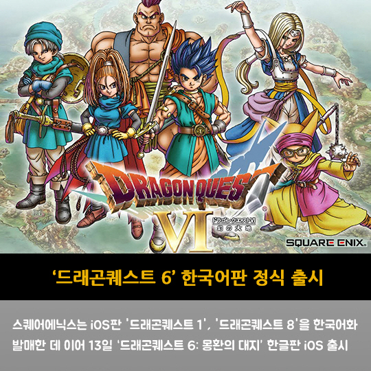 스퀘어에닉스는 iOS판 '드래곤퀘스트 1', '드래곤퀘스트 8'을 한국어화 발매한 데 이어 13일 '드래곤퀘스트 6: 몽환의 대지' 한글판 iOS 출시