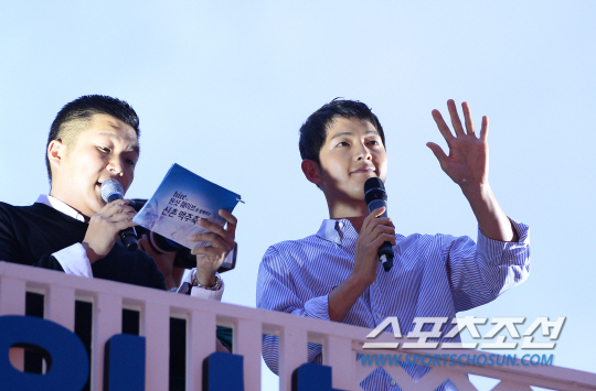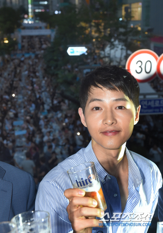 배우 송중기는 14일 오후 서울 신촌 연세로에서 열린 맥주 페스티벌에 참석해 시민들과 즐거운 시간을 보냈다. 송중기가 등장하자마자 수많은 팬들이 사거리 일대에 대거 몰려 그 인기를 실감케했다.