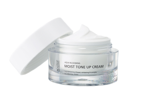 아쿠탑의 아쿠아 블루밍 모이스트 톤 업 크림이다. 화이트닝으로 특허를 받은 금불초 꽃 추출물을 담았다. 장시간 피부 수분을 머금게 해주어 처음 바른 그대로 촉촉함을 유지시켜주는 제품이다.