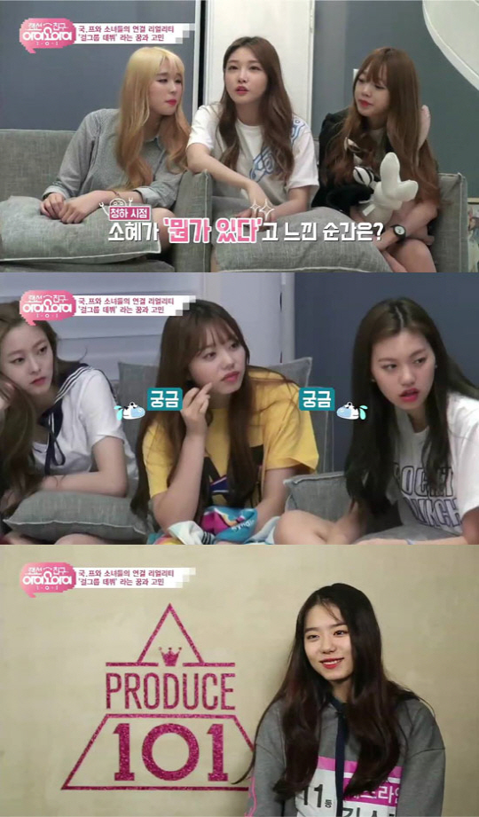 또 모두가 '프로듀스101'이라는 큰 산을 함께 넘은 친구들인 만큼 프로그램에 대한 비하인드 스토리를 하나 둘 꺼내며 이야기 꽃을 피우기도 했다고. 이들은 누구나 다 힘든 프로그램이었지만 특히 김소혜가 고생이 많았다며 입을 모았다. 특히 김청하는 김소혜에게 무언가 특별한 것이 있다고 느꼈던 때를 회상하며 "소혜 다음 차례로 인터뷰를 기다리고 있었는데 장시간 촬영으로 지쳐 있었음에도 불구하고 한 시도 쉬지 않는 격한 리액션을 하더라. 에너지가 정말 대단한 아이라고 느꼈다"고 칭찬했다. 이에 김소혜는 "아무리 힘들고 지쳐도 인터뷰 질문을 받으면 기운이 났다"고 답해 '프로 방송꾼'의 기질을 내비쳤다.