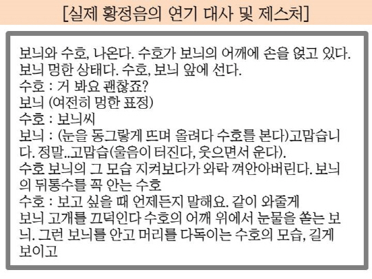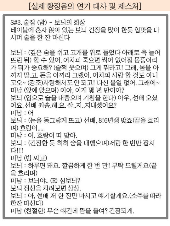 이 신에서도 황정음 특유의 발성과 대사 처리법이 고스란히 드러나고 있다. 말꼬리를 길게 뺀다거나 돌연 목소리를 키워 강조하는 식이다. '사랑해서도 안되고!'라고 강조하는 방식과 선배에게 '저랑 한 번만 잡시다!'라고 외치는 방식은 전혀 다른 의미의 대사임에도 불구하고 정도의 차이만 있을 뿐 거의 엇비슷한 패턴 속에 녹아있다. 표정 연기에서 역시 당혹스러울 때는 눈을 여러 번 깜박 거리고 감정의 강조점을 찍을 때는 눈을 동그랗게 뜨는 패턴이 반복된다.