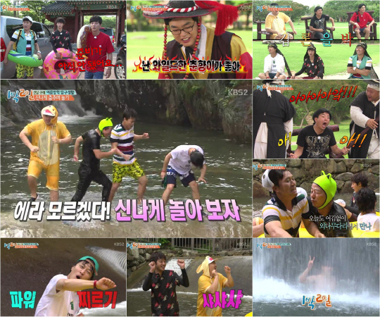 [스포츠조선닷컴 김준석 기자] 여름방학을 맞이한 '1박 2일'이 함께 놀기의 진수를 보여주며 무더위를 날린 시원한 웃음을 선사했다. 비상 연락망을 통해 소집된 멤버들은 시간과 옷차림을 서로 속고 속여 오프닝부터 빵빵 웃음을 터트렸고, 고구마 키우기 방학숙제를 검사받고 시원한 폭포서 춤신춤왕 광란의 댄스를 펼치며 시청자를 웃게 만들었다.