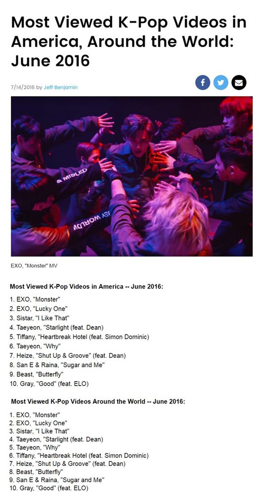 또한 엑소와 함께 지난 달 25일 공개된 태연의 'Starlight'(스타라이트), 28일 공개된 'Why'(와이) 뮤직비디오는 6월 말에 오픈됐음에도 각각 6월 미국에서 가장 많이 본 K-POP 뮤직비디오 차트 4, 6위, 전 세계 차트 4, 5위에 올랐음은 물론, 지난 달 10일 공개된 티파니의 'Heartbreak Hotel(feat. Simon Dominic)'(하트브레이크 호텔) 뮤직비디오도 6월 미국, 전 세계 차트의 5위, 6위에 등극, 빌보드는 이러한 성과에 대해 "이번 달은 엑소, 태연, 티파니 등 SM 소속 아티스트가 차트의 반을 차지하는 활약을 보였다"고 소개하며 SM 아티스트의 저력에 대해 조명해 눈길을 끌었다.