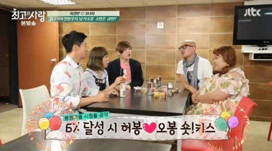 또 문희준은 "두 사람에게 공약이 있었으면 좋겠다"며 "시청률 6%가 되면 눈 딱감고 1분만 딥키스를 하는 것이 어떠냐"고 제안했고, 오나미는 기다렸다는 듯이 "네"를 외쳐 웃음을 자아냈다.