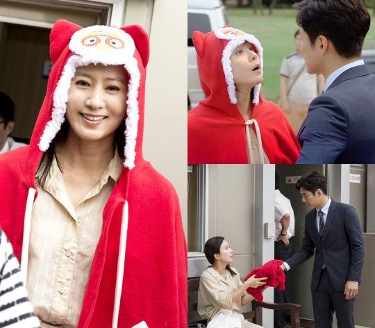 [스포츠조선닷컴 정안지 기자]SBS 새 특별기획 '끝에서 두 번째 사랑'(극본 최윤정, 연출 최영훈)에서 김희애가 '뽀로로' 망토를 쓰고 웃음짓는 모습이 포착되었다.