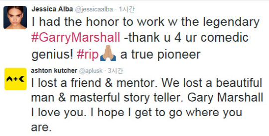 20일(현지시각) 미국의 연예 매체들은 거장 게리 마셜의 타계 소식을 전했다. 이에 애쉬튼 커쳐는 자신의 SNS를 통해 "나의 친구이자 멘토를 잃었다. 우리는 아름다운 남자이자 스토리 텔러의 거장을 잃었다. 게리마셜 사랑합니다"라며 애도의 뜻을 전했다. 게리 마샬 감독의 '발렌타인 데이'에 출연했던 제시카 알바 역시 그의 죽음을 슬퍼했다. "로맨틱 코미디의 선구자"라고 표현한 그녀는 그와 함께 한 작품 사진들을 게재했다. 이밖에도 많은 할리우드 영화 관계자와 배우들이 그의 죽음을 애도하고 그의 업적을 되새겼다.