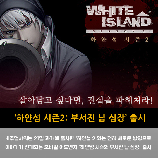 비주얼샤워는 21일 과거에 출시된 '하얀섬 2'와는 전혀 새로운 방향으로 이야기가 전개되는 모바일 어드벤처 '하얀섬 시즌2: 부서진 납 심장' 출시