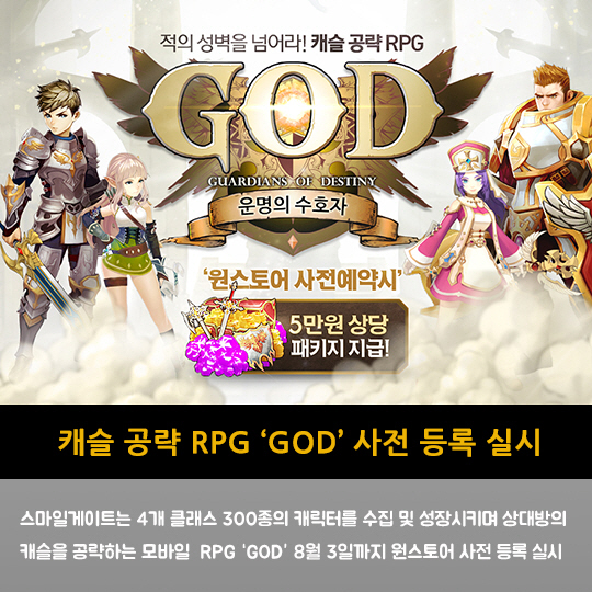 스마일게이트는 4개 클래스 300종의 캐릭터를 수집 및 성장시키며 상대방의 캐슬을 공략하는 모바일 RPG 'GOD' 8월 3일까지 원스토어 사전 등록 실시