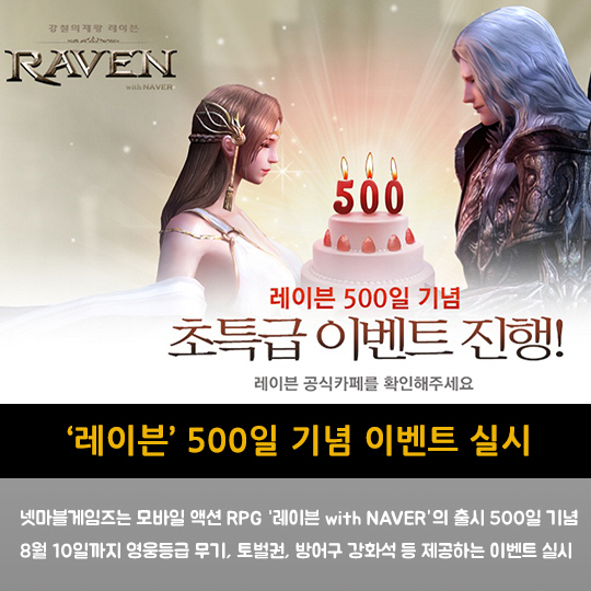 넷마블게임즈는 모바일 액션 RPG '레이븐 with NAVER'의 출시 500일 기념 8월 10일까지 영웅등급 무기, 토벌권, 방어구 강화석 등 제공하는 이벤트 실시